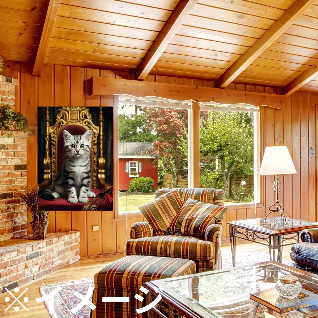 玉座に座る「アメリカンショートヘアの子猫」を描いたクラシカルポートレート(肖像画)です。