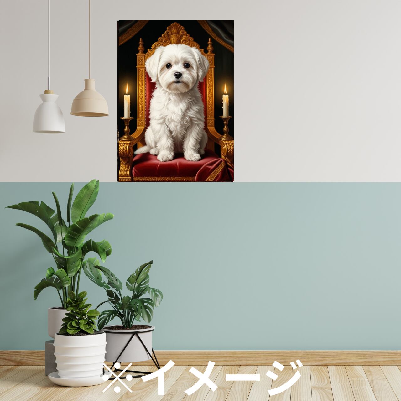 玉座に座る「マルチーズの子猫」を描いたクラシカルポートレート(肖像画)です。